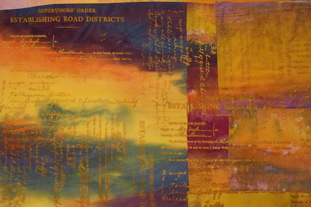 I decided to try screenprinting with metallic gold paint. The prints are converted from my grandmother's recipes that were written in an old ledger book for the Road District. The picture above shows the full piece (which is about 30" wide). The images below are details.